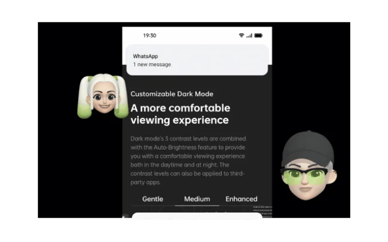 - En ColorOS puedes elegir distintas intensidades del modo oscuro, o qué apps lo pueden usar.