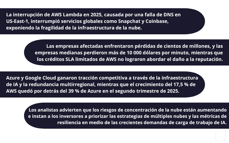 Un artículo reciente subraya que muchas organizaciones descubrieron demasiado tarde que sus cargas clave estaban concentradas en la región más afectada (us-east-1), lo que resalta la importancia de tener visibilidad completa de tus recursos.