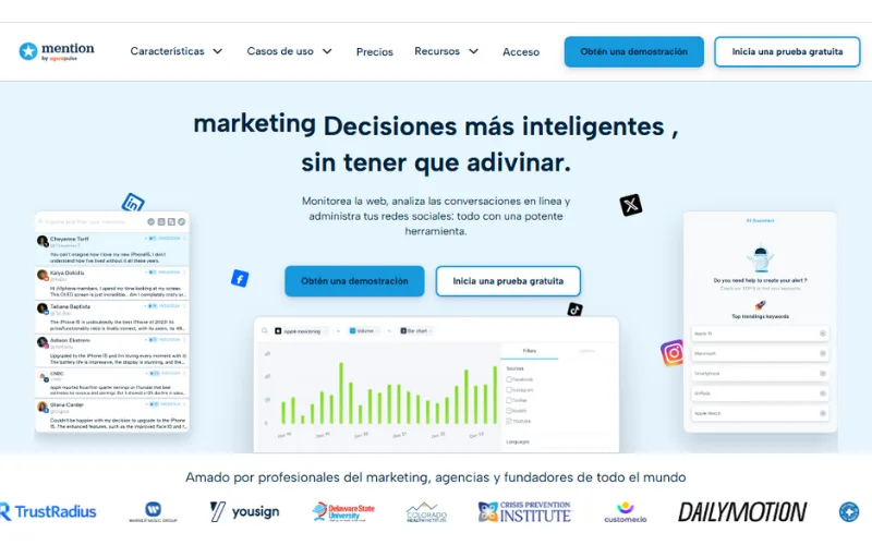 Por ejemplo, plataformas como Mention permiten monitorear palabras clave, menciones de marca y canales sociales variados para actuar de forma ágil.