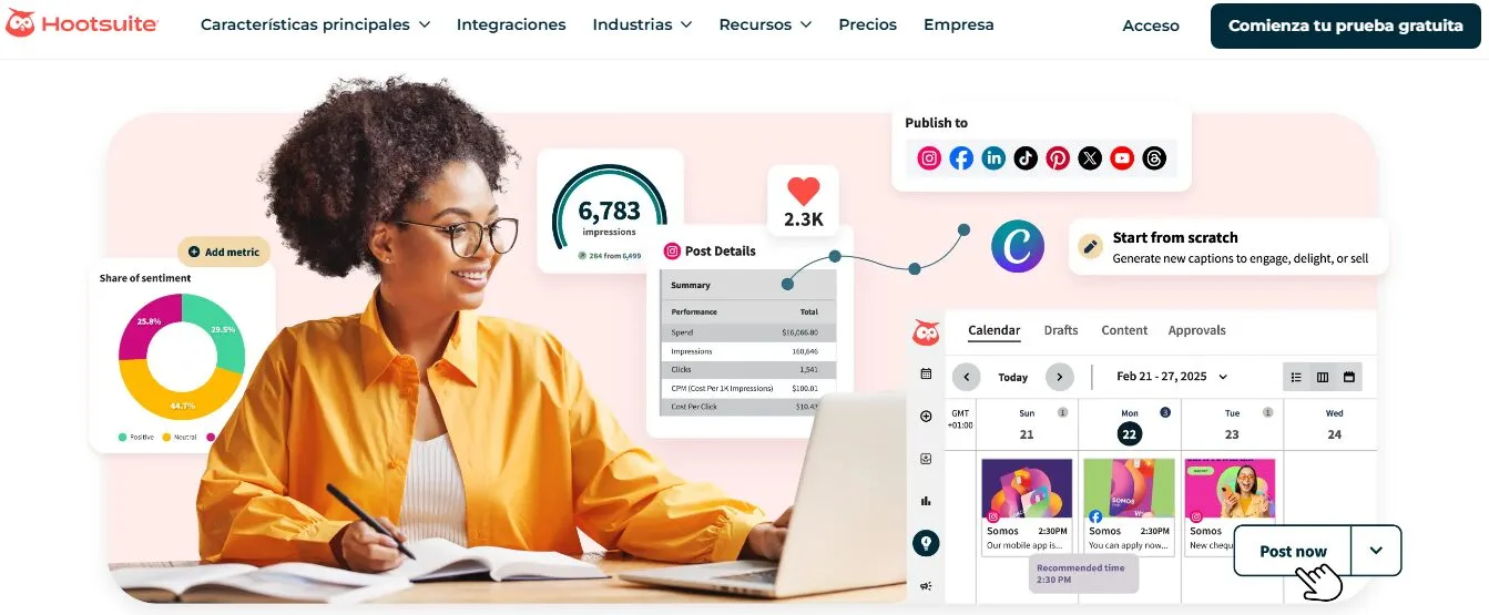 - Optimización basada en datos y tendencias: Algunas herramientas con IA no solo generan contenido, sino que lo adaptan al mejor formato, red social, hashtags y horarios basados en análisis previos.