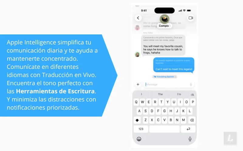 Apple Intelligence incluye Writing Tools — funciones para ayudarte a mejorar textos: resumir correos largos, corregir estilo o gramática, cambiar el tono (más formal, casual, amigable) y encontrar las mejores palabras.