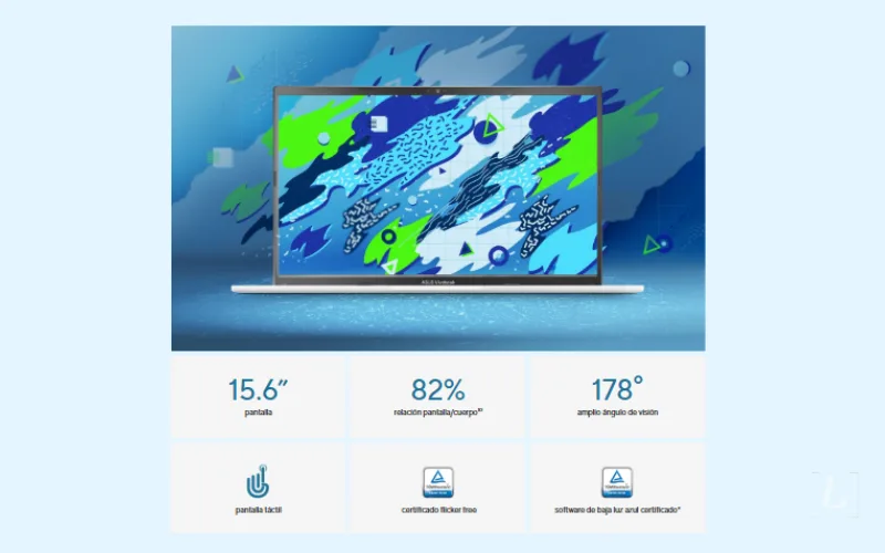 El Portátil Asus Vivobook X1502 viene con una pantalla de 15,6 pulgadas con resolución FHD (1920 × 1080), relación de aspecto “16:9”. El panel suele ser del tipo IPS-level, lo que significa que ofrece buenos ángulos de visión.