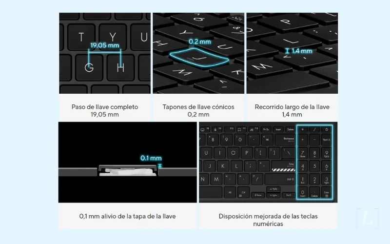 Una característica destacada del Portátil Asus Vivobook X1502 es su bisagra que permite abrir la pantalla hasta 180°, lo que facilita compartir contenido, presentaciones o simplemente ajustar la inclinación ideal para comodidad visual. Además, el teclado de tipo chiclet incluye teclado numérico, lo cual aporta valor si se trabaja con datos o tareas numéricas. La disposición de las teclas, con recorrido adecuado (≈ 1,4 mm) y buen espaciado, mejora la experiencia al escribir durante largos períodos.
