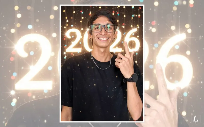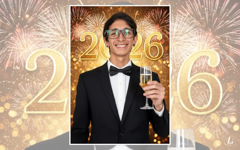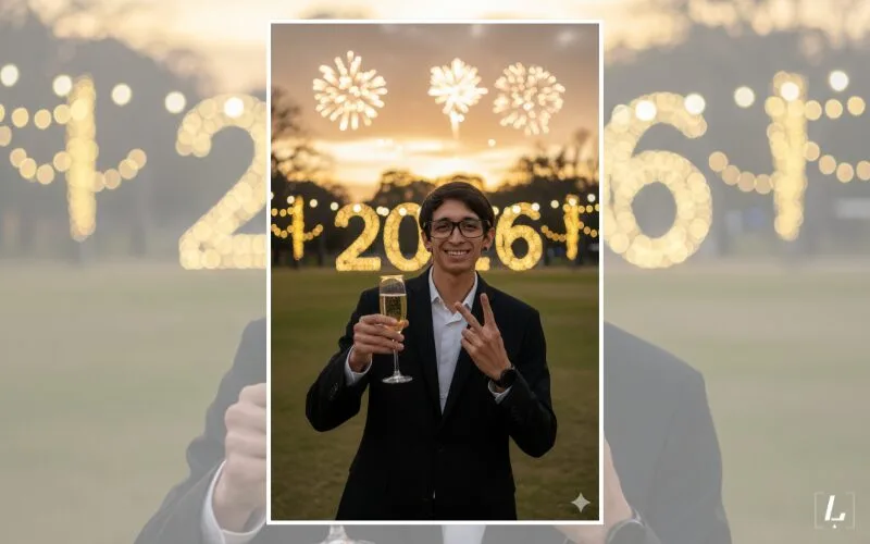 Transforma mi foto en un retrato con el número “2026” iluminado en gran tamaño detrás de mí, acompañado de luces festivas y destellos de color. Usa un estilo realista con iluminación suave y detalles nítidos.”.