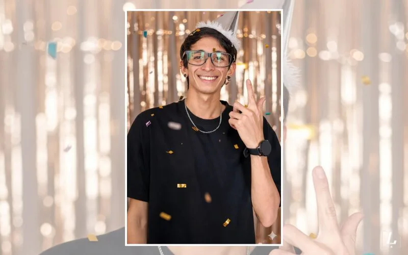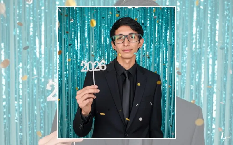“Genera una imagen elegante y festiva con un estilo fotográfico retro usando flash, con aspecto fotorrealista 8K. En el centro aparece la persona de la foto adjunta con una actitud calmada y sofisticada, mirando directamente a la cámara. Vísteme elegante. En su mano derecha sostiene un adorno metálico brillante con el número “2026” tipo cake topper. El fondo está decorado con una cortina de tiras metálicas azul turquesa, y la escena está llena de confeti cayendo y partículas luminosas estilo bokeh, creando una sensación de celebración en el aire. Añade destellos de luz que generen pequeños reflejos como estrellas sobre las superficies metálicas. Dale a la foto una ligera textura de grano y una saturación de color que evoque las cámaras analógicas de los años 90 y principios de los 2000, con un flash frontal marcado que produce sombras suaves pero definidas detrás del sujeto”.