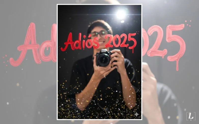 “Crea una ilustración realista que refleje un instante de celebración de Año Nuevo con enfoque en el ambiente festivo. El elemento central debe ser un texto pintado a mano sobre un espejo con un tono rojo intenso que simule aerosol. El mensaje dice “Adiós 2025”, escrito con estilo cursivo fluido y una textura cremosa e imperfecta, como un graffiti sobre cristal. Detrás del texto, coloca a la persona de la foto adjunta ligeramente desenfocada con efecto bokeh para dar sensación de profundidad. Estoy tomando una selfie frente al espejo con una sonrisa divertida dirigida a la cámara. Llevo ropa negra y se ve una cámara digital negra en mis manos. La iluminación principal debe provenir de un flash directo sobre mí, con un fondo oscuro y minimalista que resalte el texto rojo. En el primer plano, añade partículas de brillantina dorada y plateada suspendidas en movimiento. Apariencia fotorrealista 8K”.