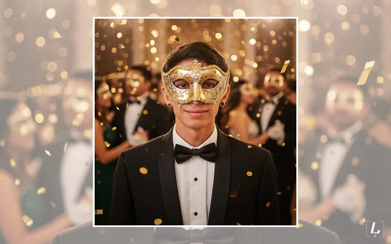 “Genera una escena de una celebración elegante y lujosa con apariencia fotorrealista en 8K. La persona principal de la imagen es la que aparece en la foto adjunta. Está vistiendo un esmoquin clásico si es hombre o un vestido de lentejuelas doradas de manga larga con escote redondo si es mujer. Además, lleva puesta una máscara veneciana elaborada en tonos dorados y plateados, adornada con pedrería y relieve, cubriendo la parte superior de su rostro. La escena está repleta de confeti metálico dorado cayendo por todos lados, con piezas redondas pequeñas y otras rectangulares que dan sensación de movimiento. La iluminación general debe ser cálida con luces suaves desenfocadas en el fondo, creando un efecto bokeh que aporta profundidad y una atmósfera mágica. Detrás de la figura principal, se ven difuminadas otras personas con atuendos similares, como si fuera una fiesta concurrida o una pista de baile elegante”.