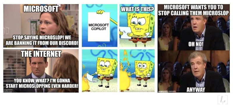 El meme se volvió tendencia en 2026 cuando algunos usuarios comenzaron a usar la palabra Microslop para burlarse del exceso de funciones de inteligencia artificial dentro del ecosistema de Microsoft.