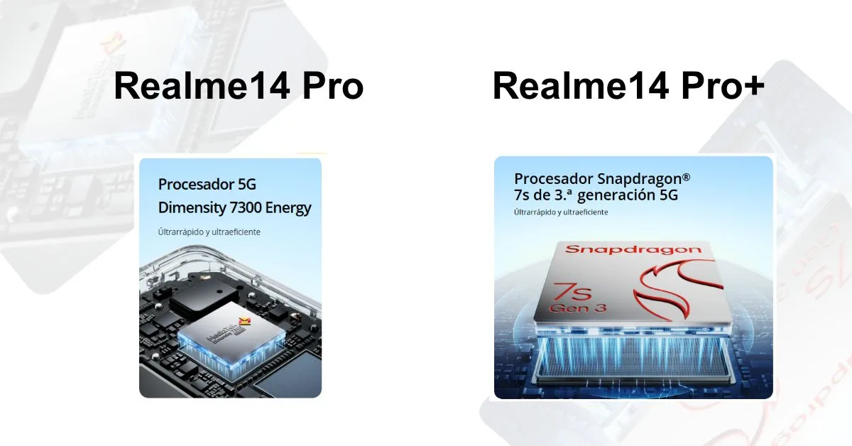 En términos de rendimiento, el Realme 14 Pro está equipado con el procesador MediaTek Dimensity 7300, mientras que el Realme 14 Pro+ incorpora el Qualcomm Snapdragon 7s Gen 3. Ambos chips ofrecen un rendimiento sólido para tareas cotidianas y juegos ligeros. La diferencia radica en la optimización y la eficiencia energética de cada uno.