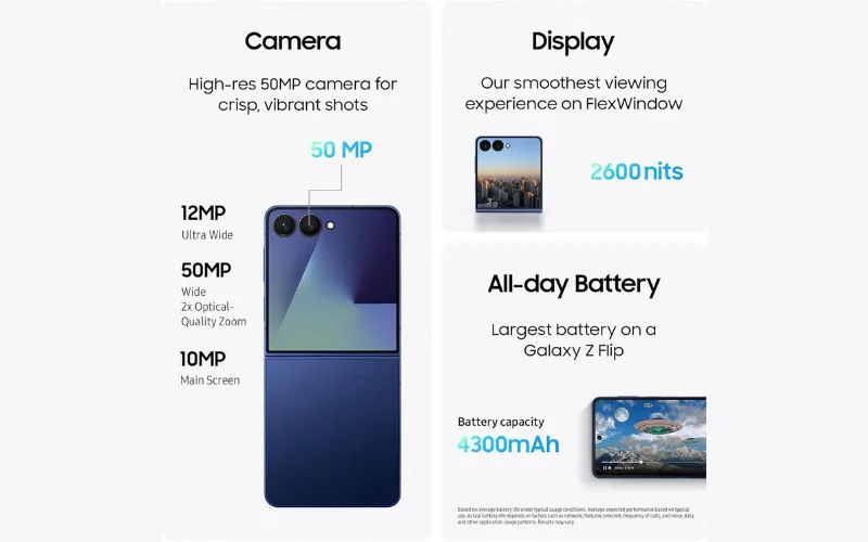 El Galaxy Z Flip 7 está potenciado por el chip Exynos 2500, de 3 nm, acompañado de 12 GB de RAM y opciones de almacenamiento de 256 GB o 512 GB.