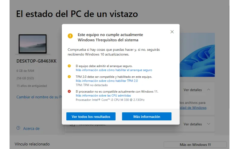 Antes de decidir qué hacer, conviene identificar exactamente qué elemento impide la compatibilidad (por ejemplo, falta TPM 2.0, Secure Boot desactivado, procesador no en la lista, u otros). Después:
